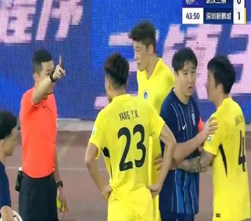第43分钟,杨一鸣肘击沈子贵,张雷出示红牌将其罚下,新鹏城10人应战。深圳新鹏城众将投诉无果,这一判罚引发球迷不满。