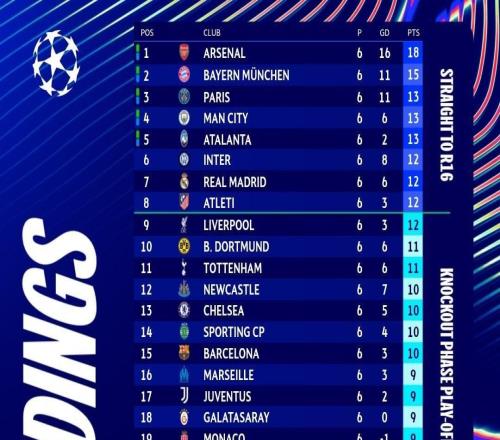 欧冠积分榜:阿森纳继续全胜领跑,拜仁3分之差位列第二 -